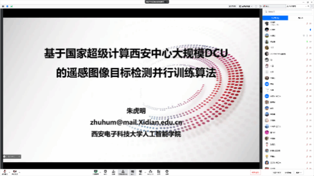 的侯正雄副教授主持了超算前沿技术研讨会。郭伟科老师介绍了国家超级计算西安中心的建设和应用情况,潘书诚教授和牛海洋教授分别作了题为《基于国家超级计算西安中心的流体数值模拟程序开发》、《基于深度学习分子动力学的材料凝固形核过程研究》的报告,朱虎明副教授作了题为《基于国家超级计算西安中心大规模DCU的遥感图像目标检测并行训练算法》的报告。与会者围绕超算和人工智能融合的应用、自主研发和开源软件等展开了热烈讨论。