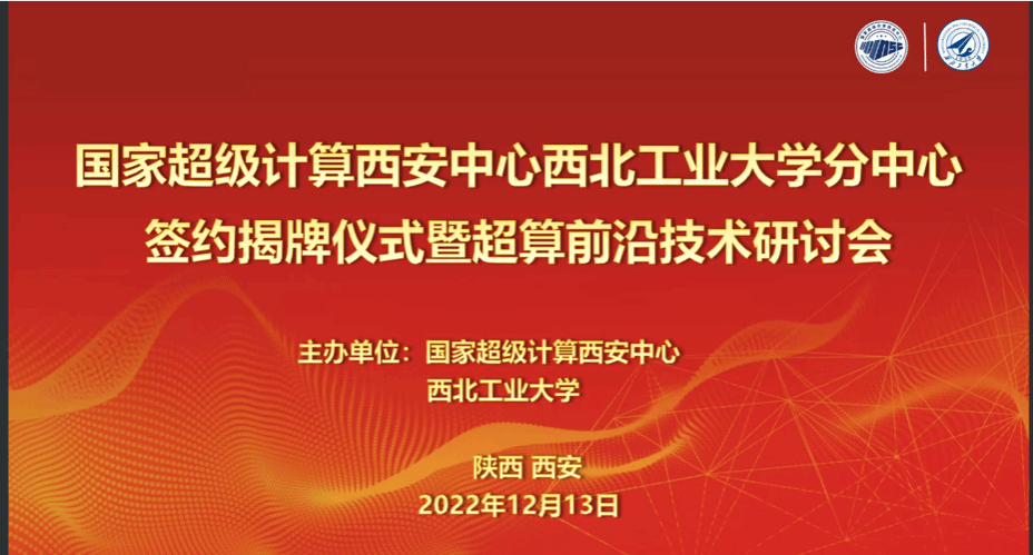 2022年12月13日,在陕西省科学技术厅、西安市科学技术局、西安国家民用航天产业基地管理委员会的指导下,西北工业大学在线上举办了国家超级计算西安中心西北工业大学分中心签约揭牌仪式暨超算前沿技术研讨会。