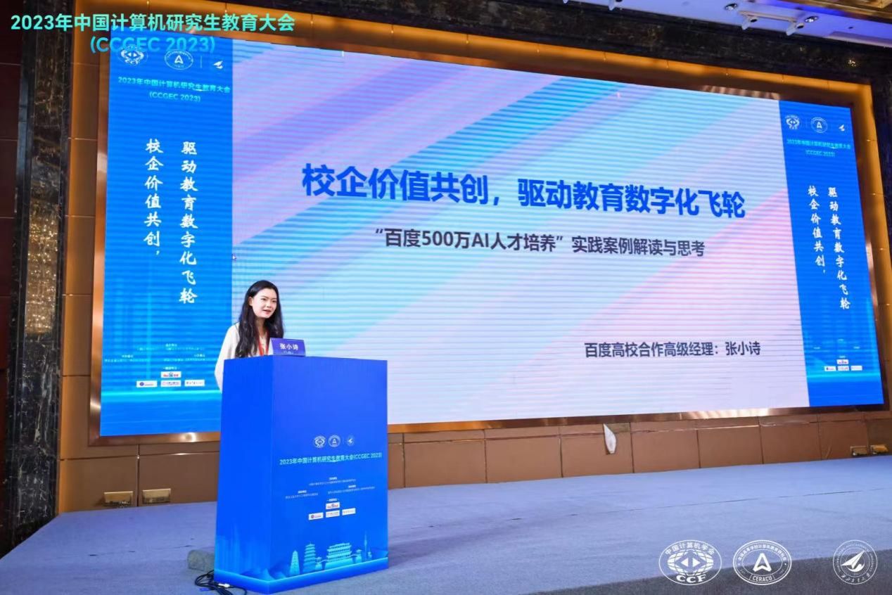 百度集团校企合作部高级经理张小诗作了题为《校企价值共创,驱动教育数字化飞轮》的报告,介绍了百度500万AI人才培养的实践案例,通过提供资金支持、与高校共建课程体系、举办高校师资培训班及各类AI竞赛等措施,来实现位社会培养500万AI人才的战略目标。