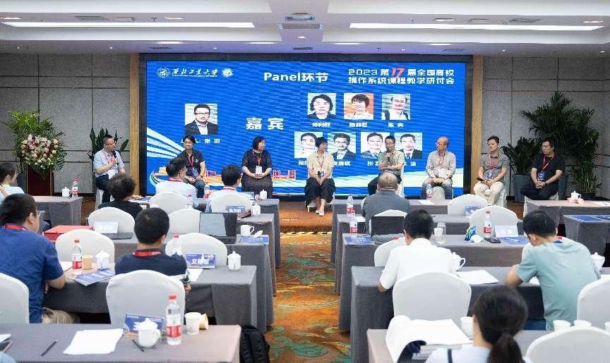 尚学群院长、西安邮电大学陈莉君教授、复旦大学张亮教授、龙芯实验室主任张福新教授、统信软件CTO张磊和清华大学陈渝教授等先后致辞和作论坛报告。本次研讨会还设置了Panel环节和12场分论坛报告。主持人、论坛嘉宾和参会教师一起就“如何激发学生对操作系统课程的兴趣、人工智能ChatGPT的出现为课程教学带来哪些挑战”等热点问题进行了深入的讨论。