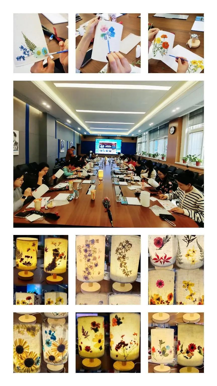 活动当天,邀请谢老师现场教学非遗手作花草灯,以创意重构自然之美,用永生干花创作个性花灯。在谢老师的指导下,女教职工沉浸式手作,通过选用不同天然干花为素材,在素色灯罩上精心构思,或用满天星点缀,或用枫叶、蕨类叶片层叠变意境,老师们经过巧妙构思和匠心拼接,从根、茎、叶、花等部分入手,最后以热熔胶定格干花的永恒之美。经过一个半小时,二十余盏风格各异、图案独特、蕴含专业元素的花草灯逐一呈现。轻轻点亮花灯,柔和的光影透过干花的缝隙洒落,仿佛将自然的灵动与艺术的静谧融为一体,瞬间点亮了每个人的笑容,也照亮了节日的温馨氛围。