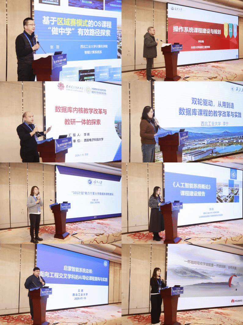 西北工业大学张羽做了“基于区域赛模式的OS课程“做中学”有效路径探索”报告,详细分析了国内外高校操作系统课程改革进展以及如何通过“操作系统设计赛区域赛”实现“以赛促课”;长安大学李东海分享了长安大学在操作系统课程教学与改革发展情况。西安电子科技大学李辉介绍了“数据库内核教学改革与教研一体的创新实践”,其团队打造的“库道”实训平台已在全球114所高校应用;西北工业大学李宁、宁夏大学杜方则围绕数据库系统课程“从用到造”的教学转型与校地协同建设数据库系统课程的经验进行了交流。人工智能导论课程方面,西北工业大学刘琰、王鹏分别结合“三航”优势与跨学科特色,分享了西工大在人工智能导论课程知识内容重构与实践模式创新的教改成果。华为西研所副所长刘晓莉带来“一杯咖啡吸收宇宙能量”的高校合作主题报告,为校企协同育人提供了新思路。