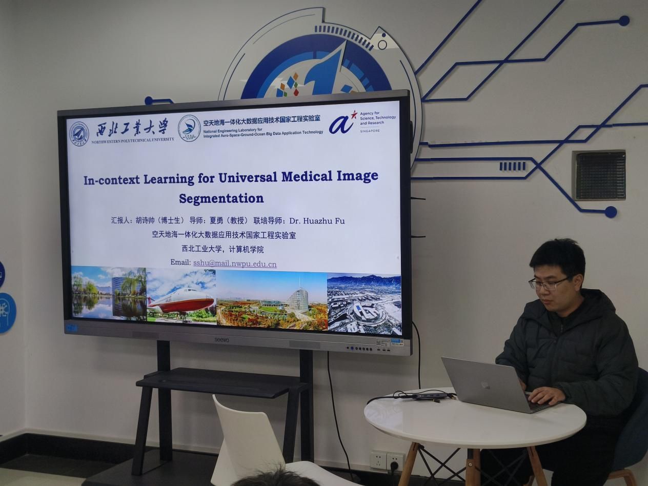 胡诗帅同学的报告题目为《基于上下文学习的医学图像分割技术研究》。在Dr. Fu的指导下,他深入探索了利用上下文学习进行医学图像分割的新方法,先后研究了针对上下文学习模型的循环上下文验证技术,以及利用2D示例作为上下文指导模型进行3D图像分割的技术。他完成了相关的实验设计及代码验证,其研究成果已有一篇论文被医学图像分析领域顶级会议MICCAI录用,另有一篇在投。报告不仅展示了其在智能医学图像分割领域的技术创新,也生动分享了他在新加坡顶尖研究所的学习收获和生活体会。
