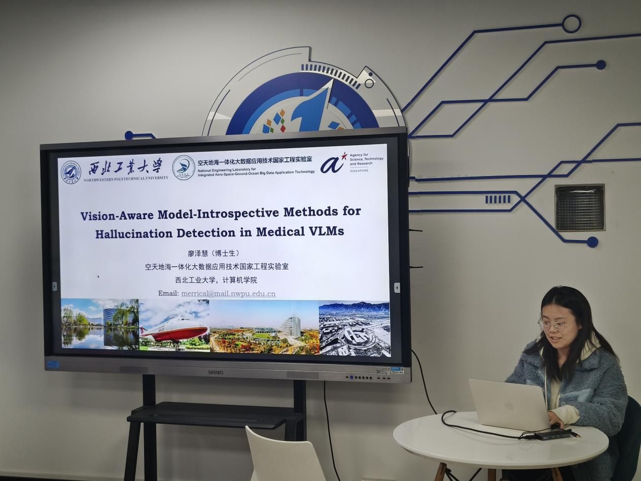 廖泽慧同学聚焦于医学人工智能领域的前沿挑战,做了题为《医学多模态大语言模型幻觉检测》的报告。她指出,幻觉问题是医学视觉语言模型面临的关键风险,可能扭曲临床发现或推理。她的研究提出了一种视觉感知的自我验证新视角,通过面向视觉的不确定性建模、基于逻辑的一致性检查以及生成回答时的注意力图自洽性评估三项创新工作,有效解决了当前幻觉检测方法中的关键缺口,为提升医学多模态大语言模型的可靠性与可信性提供了新思路。相关成果已发表或投稿至MICCAI、IEEE-TMI等本领域顶级会议期刊。廖泽慧同学硕果累累,已发表一作及共同一作论文9篇(含高被引1篇),并入选2024年度中国科协青年人才托举工程博士生专项计划,荣获多项国内外竞赛奖励。