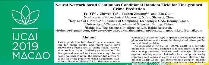 於志文教授团队完成的关于城市犯罪预测的论文“Neural Network based Continuous Conditional Random Field for Fine-grained Crime Prediction”被该会议录用。IJCAI是人工智能领域综合性会议,也是中国计算机学会(CCF)推荐的A类会议,在该领域具有极大的影响力,代表人工智能领域的最高水平和发展方向。会议源自1969年,IJCAI 2019共收到来自全球范围内的投稿4752篇,录用850篇,录用率仅为17.9%。
