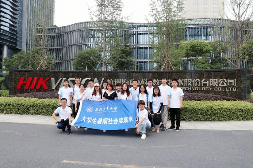 师生组成的148实践小队在研究生辅导员周颖老师的带领下,于2019年7月15日上午抵达位于浙江省杭州市的海康威视杭州总部进行参观访问。