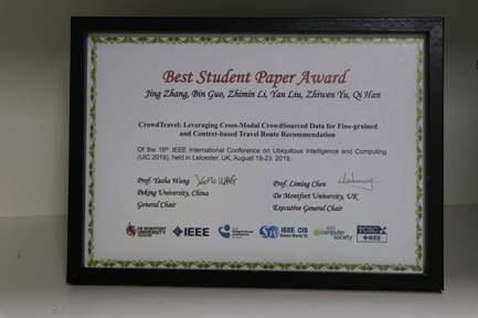 郭斌教授指导,来自智能感知与计算工信部重点实验室硕士生张靖同学的论文“CrowdTravel: Leveraging Cross-Modal CrowdSourced Data for Fine-grained and Context-based Travel Route Recommendation”获得大会唯一最佳学生论文奖。