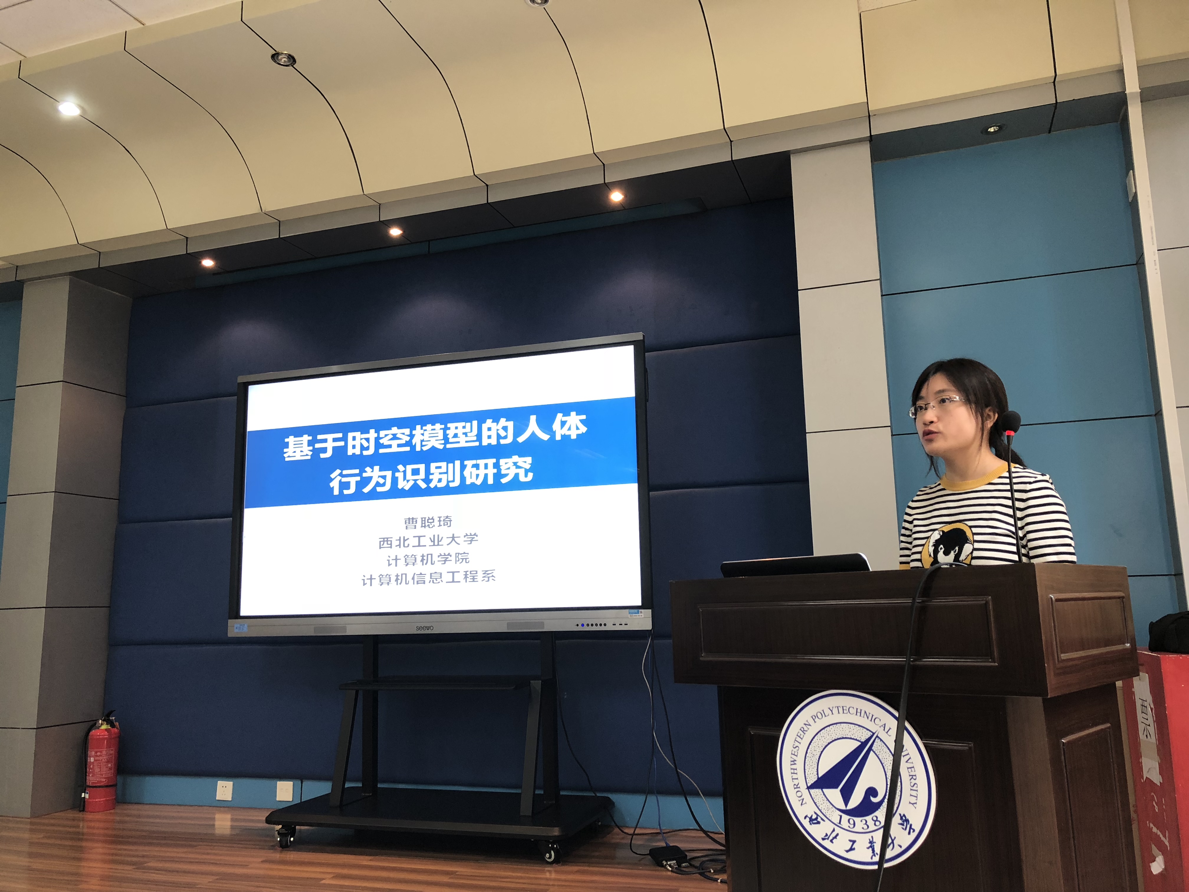 曹聪琦老师的报告题目是“基于时空模型的人体行为识别研究” ,针对很难对视频数据中的时空信息、准确识别行为进行有效建模的问题,从基于骨骼数据、基于彩色视频数据、以及结合骨骼信息与彩色视频三方面介绍了所提出的行为识别方法,并且针对第一视角交互手势识别应用提出能够自动去除相机全局运动的学习算法。
