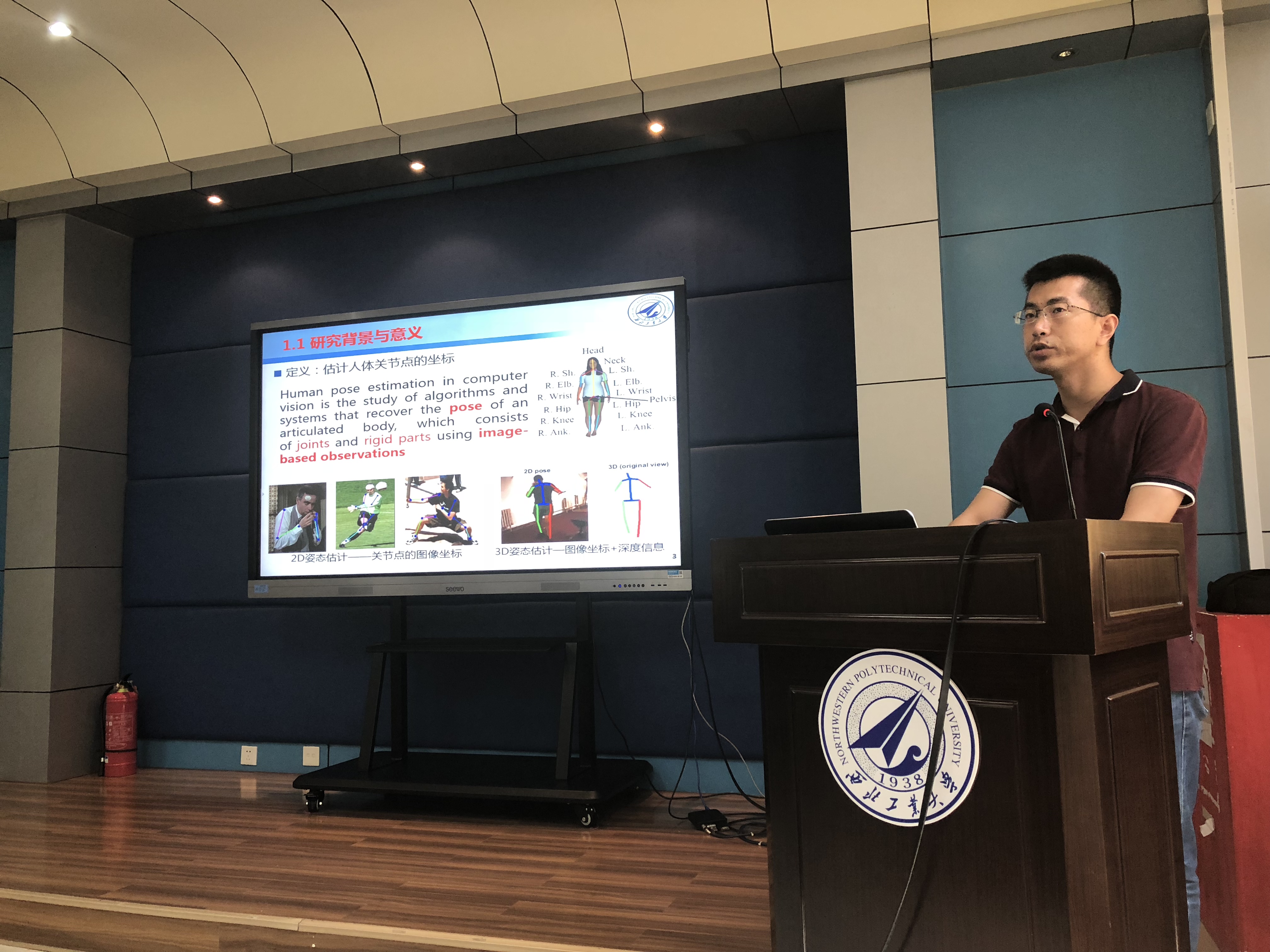 梁国强老师做了题为“人体姿态估计及其在跨视角身份识别方面的应用研究”的报告。首先,提出一种基于肢体图模型的二维人体姿态估计方法,使用一种结构关系模型联合建模人体肢体和关节点的关系,取得了较好的估计准确度。第二,从人体关节点位置的估计准确度不一致出发,提出一种基于人体姿态估计置信度的跨视角身份识别,验证了不准确的姿态仍能用于身份识别。