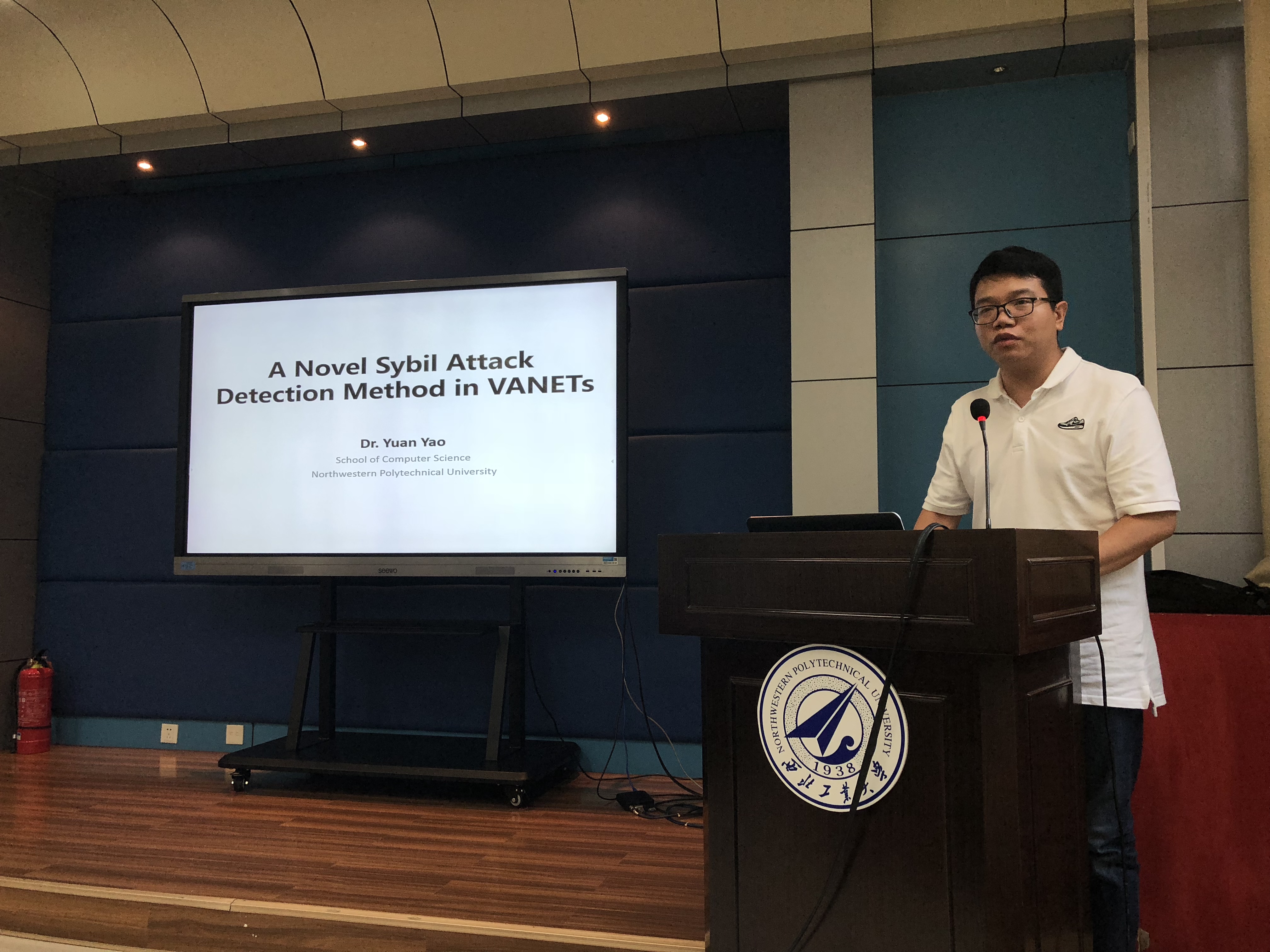 姚远老师就“车载无线自主网中的Sybil Attack检测”做了报告,针对车载网络中Sybil Attack这种恶意攻击方式,提出了一种不依赖于信道模型的纯分布式检测方法。通过对RSSI时间序列的相似度检测替代直接测距定位。同时,针对恶意节点采用控制发送功率来改变RSSI序列的问题,提出了基于多突变点检测的方法来预估,该设计方法在仿真和实车环境下进行了实验验证,取得了较好的效果。