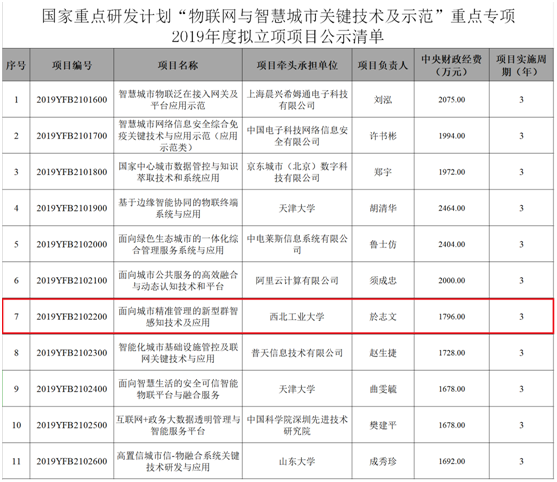 於志文教授牵头,中国科学技术大学、北京邮电大学、上海交通大学、东南大学、西安交通大学、北京航空航天大学、西安航天自动化股份有限公司、广州高新兴机器人有限公司、西安市轨道交通集团有限公司等单位共同承担的国家重点研发计划“物联网与智慧城市关键技术及示范”重点专项“面向城市精准管理的新型群智感知技术及应用”项目(项目编号:2019YFB2102200)已获立项资助。该项目总经费4796万元,其中国拨经费1796万元,实施周期3年。