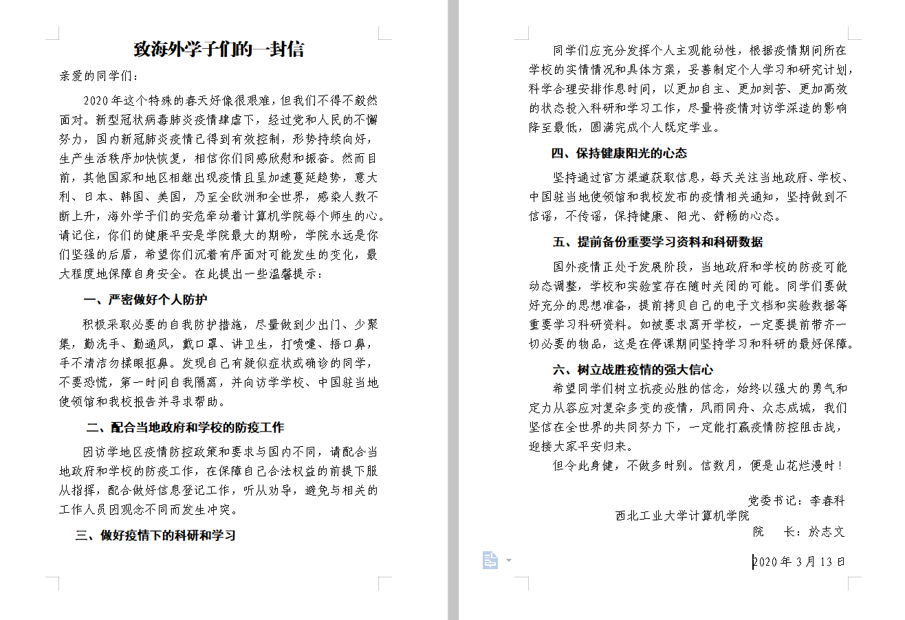 接到学院的邮件、牵挂和关心,海外学子们非常激动和感动。有学子回信说:“非常感谢母校的雪中送炭,让我们可以得到有效的保护,免于恐慌不安,可以安心静心学习。同时,看到亿万人民在党中央的正确领导下万众一心,很快有效控制住新冠肺炎疫情,国内生产生活秩序加快恢复,我们深深为拥有这样的祖国和人民而感到骄傲和自豪;在这种危机和特殊时期下,我们才更清楚认识到中国制度、中国方案的优越性。我爱你,中国!我爱你,我的西工大!我们将以更加勤奋刻苦的态度,力争早日学成,报效我们伟大的祖国!”