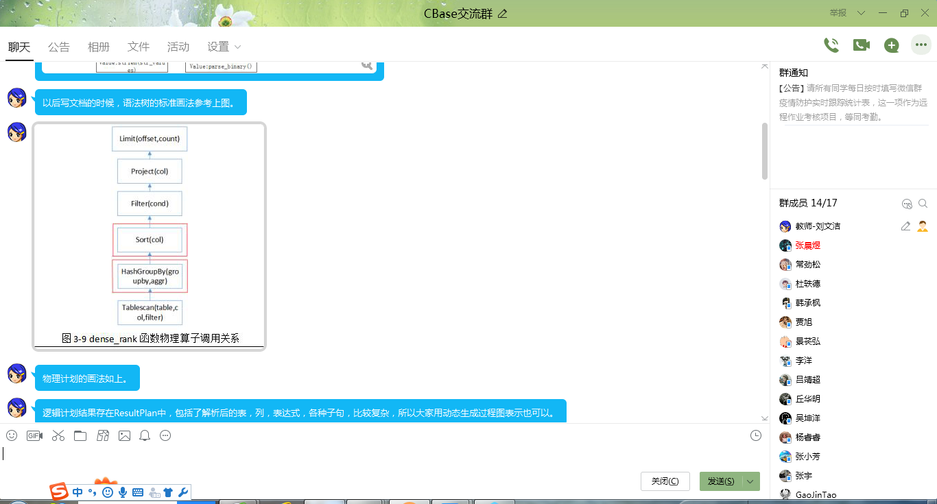 刘文洁老师的课题组的研究生主要做分布式数据库相关的研究和开发工作。这个方向需要的背景知识多,对编译原理、操作系统、网络、数据结构、数据库、大数据等课程都要具备扎实的基础和较强的实践能力,能够修改数据库核心代码。但是,研一的学生基础比较薄弱,很多同学到了项目组都是从零开始,而项目组的研发工作也不能停。所以,新同学的培训和指导就成了非常重要工作。为此,刘老师为项目组制定了非常严格的考勤制度,每周周会前都要发出周报,汇报一周工作和遇到的问题。周会当天还要跟学生进行一对一的交流,解决每个学生遇到的问题。平时,对很多学生共同存在的问题,刘老师还会在项目群里给出方法或指导意见,推进学生的工作。如果有学习进度严重滞后的同学,刘老师还会及时和学生沟通,一起讨论解决方案。